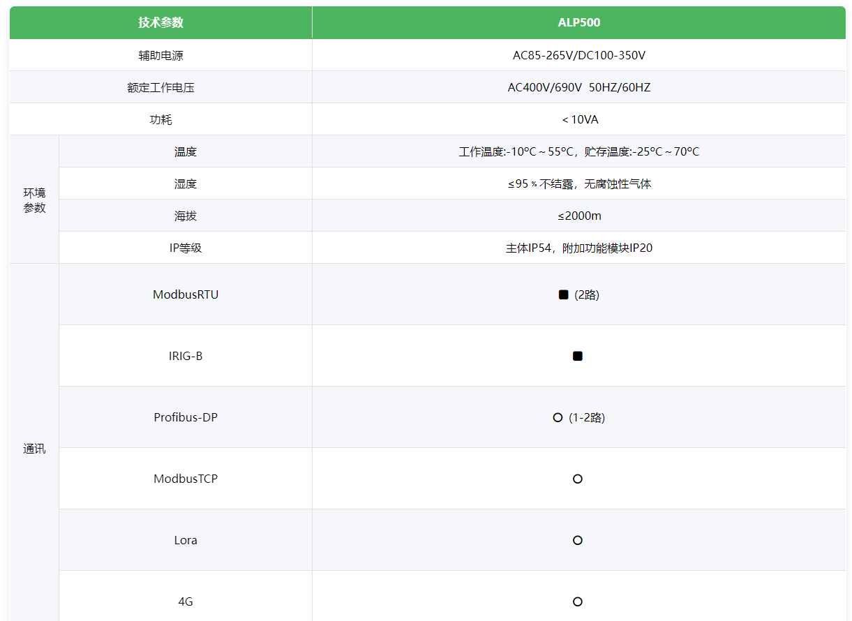 ALP500低压保护测控装置适用于额定电压至AC690V低压配电回路,集电力监控、馈线保护、分合闸控制、通讯组网、节点测温、运维管理等功能于一体。具备反时限过流、三段式过流、过功率、零序过流、欠压、过压、不平衡(电压、电流)、零线过电流、漏电流等多种保护功能。可选配不同通讯模块适应现场通讯需求。该产品采用嵌入式安装,由主体、互感器和选配的功能模块组成。