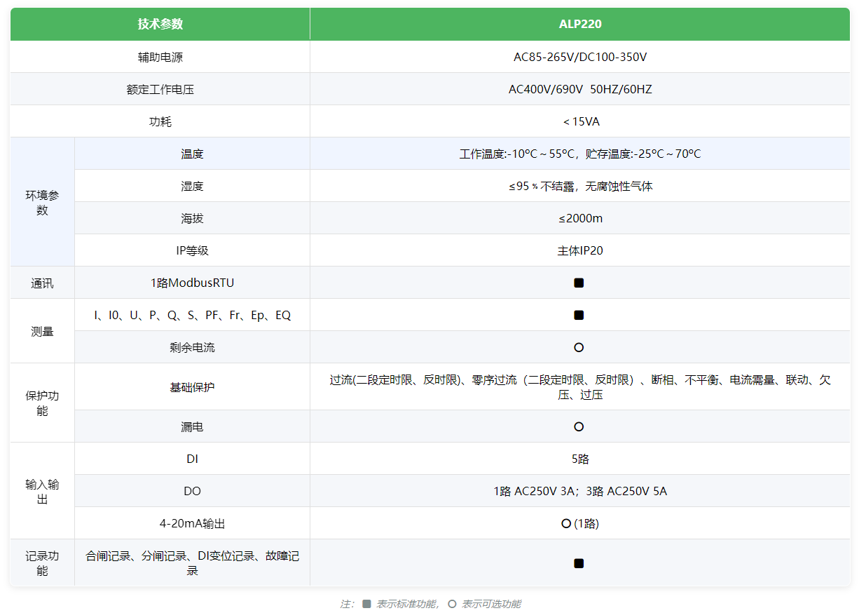 ALP220 系列智能型低压线路保护器,适用于额定电压至 AC690V 低压配电回路,体积小,结构紧凑,安装方便,是低压馈线终端的保护、监测和控制的智能化综合装置。集保护、测量、控制、总线通讯为一体,同时提供了远程自动控制、现场直接控制、面板指示、信号报警、操作记录、跳闸报警记录及开关量记录等功能。